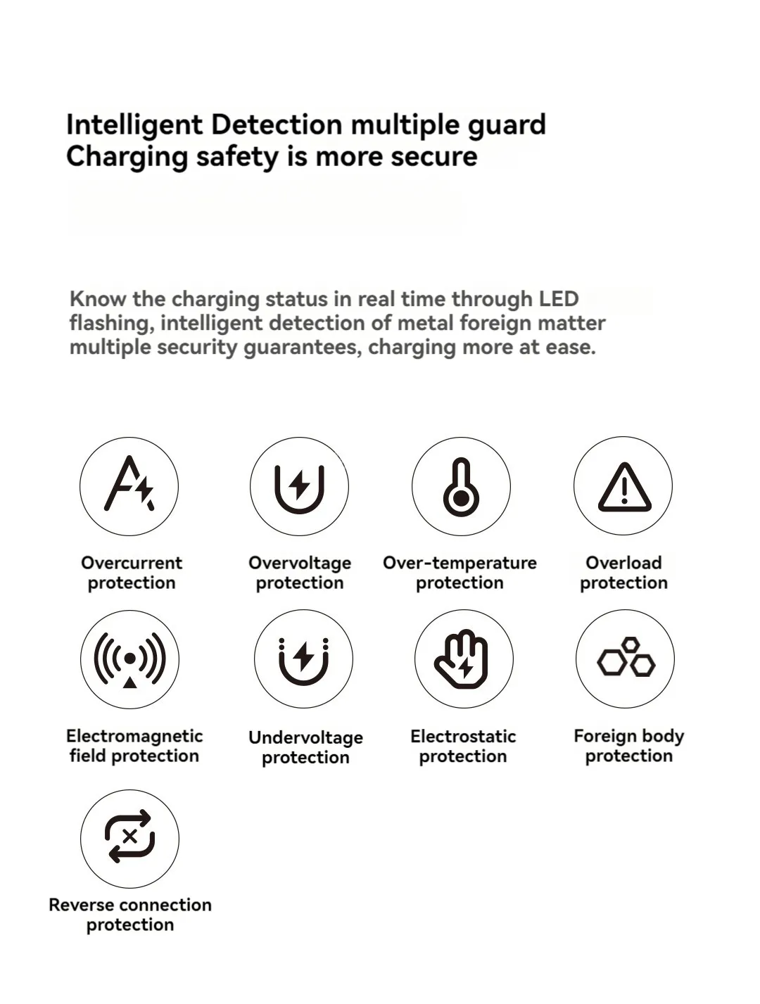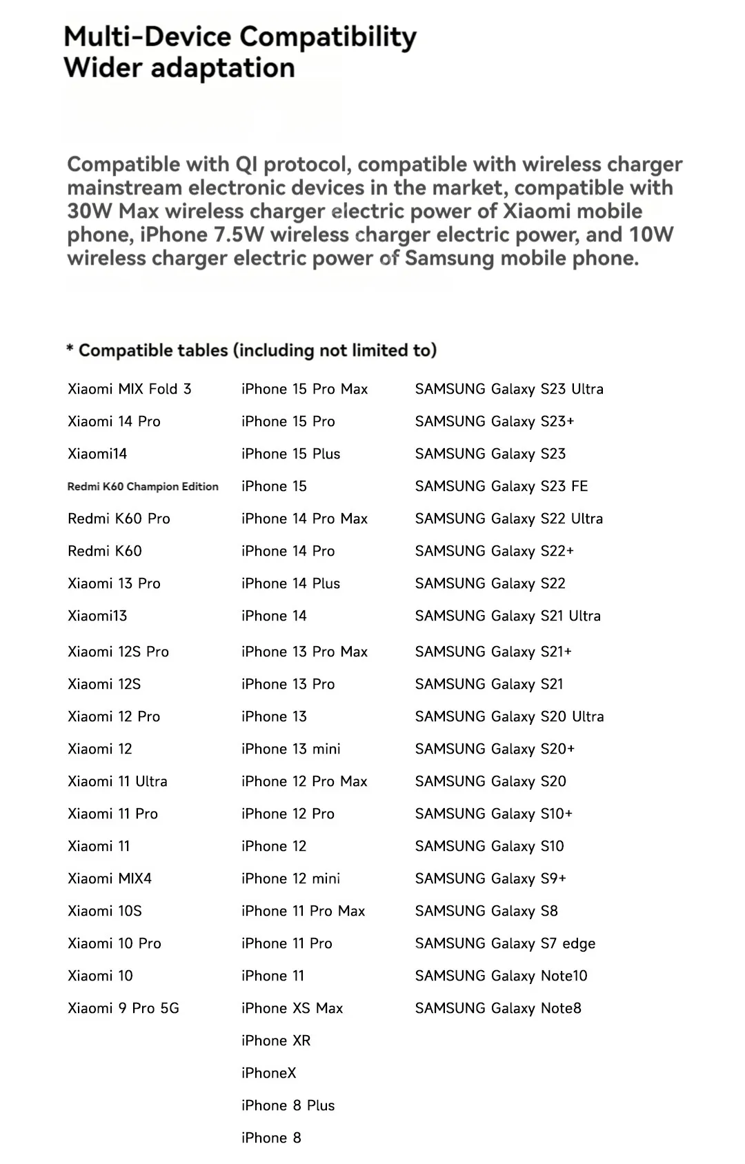Compatible with Ql protocol, compatible with mainstream wireless charging electronic devices on the market, compatible with Xiaomi phone 30W Max wireless charging power, IPhone 7.5W wireless charging power, Samsung phone 10W wireless charging power. (Please refer to the compatibility list in the product description for details.)↓
