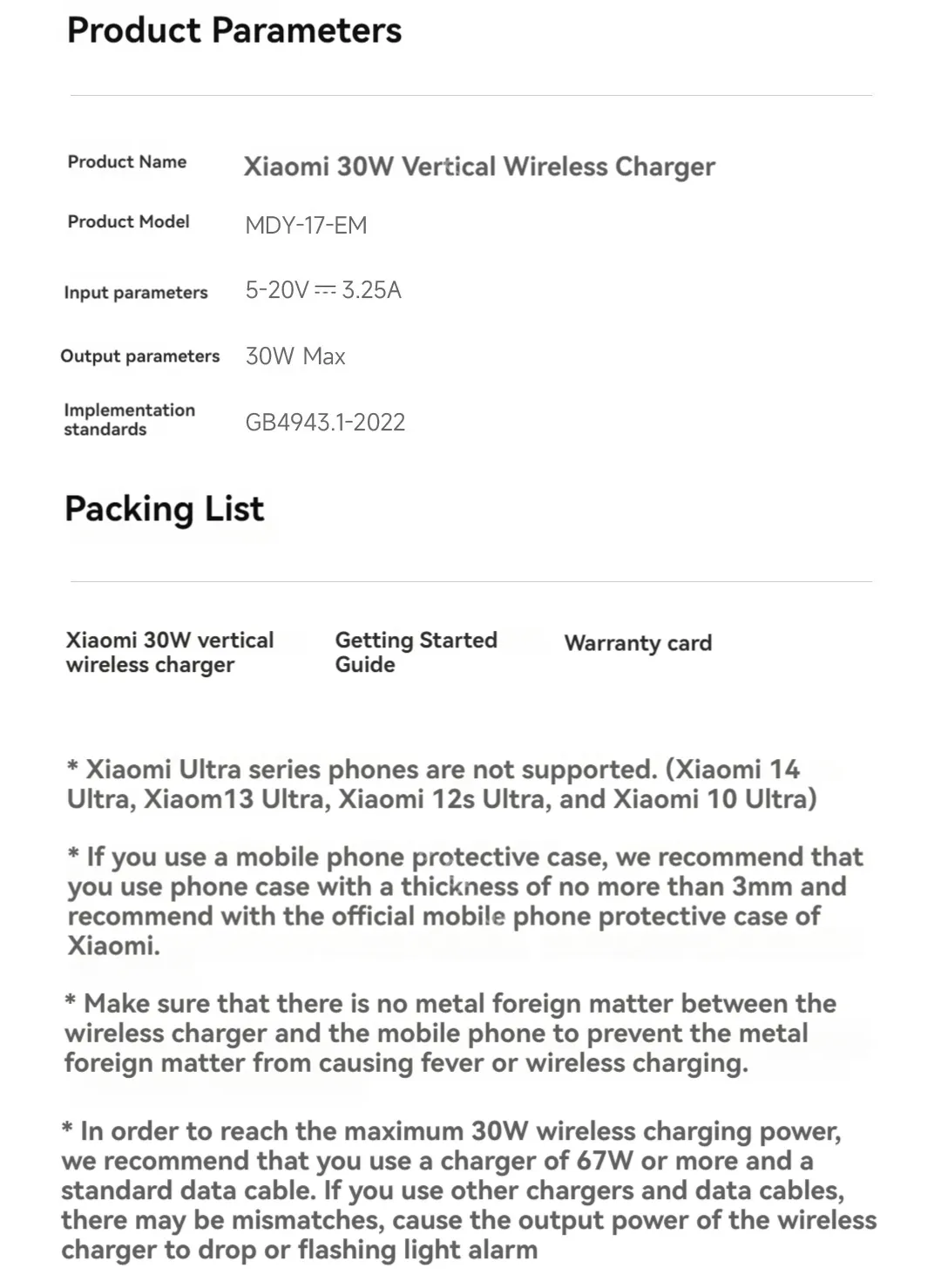 To achieve a maximum wireless charging power of 30W, it is recommended to use a charger with 67W or higher and a standard data cable. Using other chargers or data cables may cause mismatches, resulting in a decrease in wireless charger output power or flashing lights and alarms.